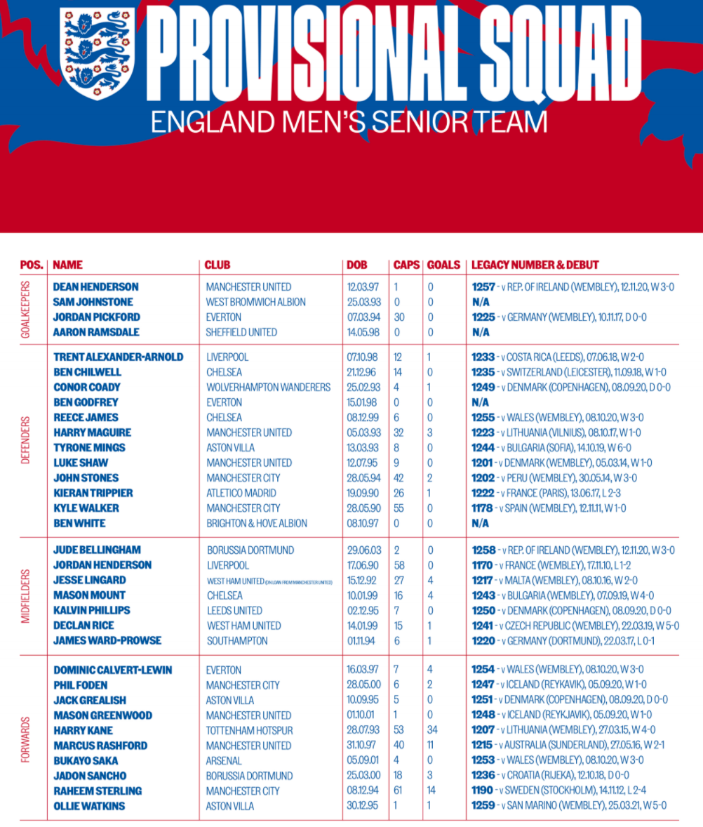 The inclusion of ten attackers owes to England’s incredible depth in forward positions at present. Bukayo Saka is the most noteworthy inclusion, joined by mainstays Raheem Sterling, Marcus Rashford, Jack Grealish, Jadon Sancho and Phil Foden in the wide-forward areas. Manchester United’s Mason Greenwood and Grealish’s Aston Villa teammate Ollie Watkins feature as players capable of being deployed out wide or down the middle. The two out-and-out strikers are Dominic Calvert-Lewin and captain Harry Kane, who became only the third player to register the most goals and most assists in a single Premier League season.