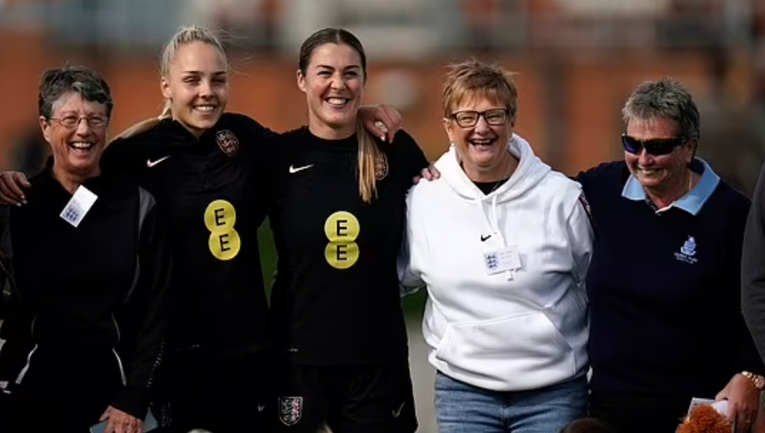 As the England team finish their training session in Teddington, the rain takes its leave for a moment and in its place a second group of older women floods the pitch. They look delighted to meet the England players, grinning, chatting, and posing for photos. But these women are not merely England fans. They are the first Lionesses.